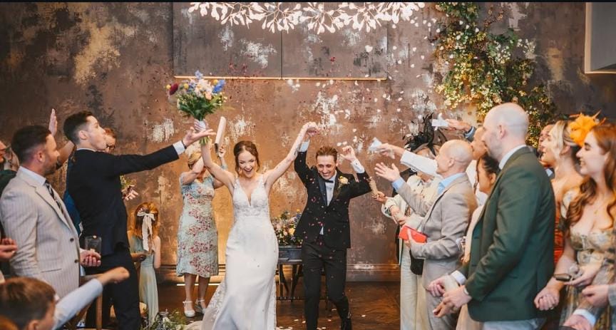 Miles and Alexis positively danced out of their ceremony to the giant TOON,